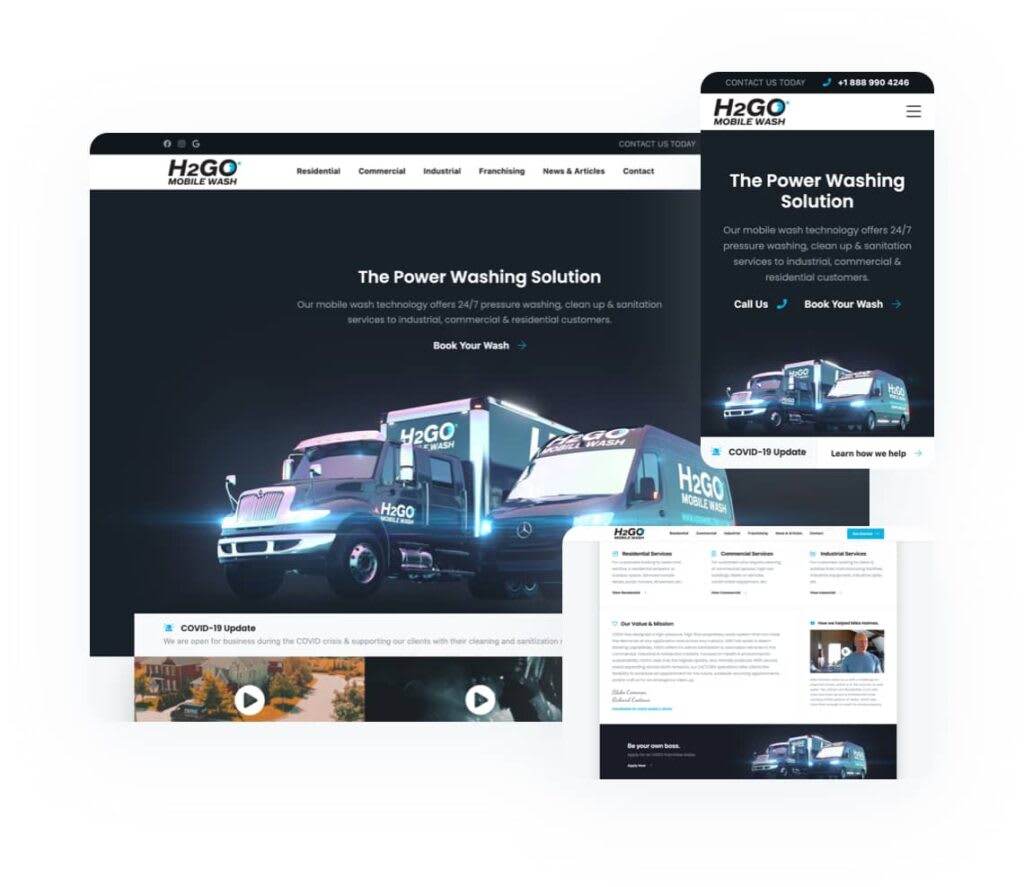 Our decade-long partnership with H2GO Mobile Wash is a great example of how we work with growing companies to help them scale, increase revenues, and expand brand awareness. We work alongside H2GO on an on-going basis as their technology and marketing arm. We designed, developed and now maintain their website including the SEO-optimized content you read throughout. We implemented Hubspot as their CRM to optimize their sales pipeline, and are responsible for their ongoing marketing and advertising campaigns.